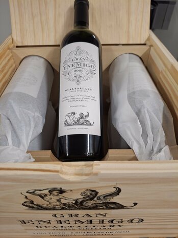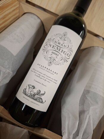 Parker: 99/100 2021 Gran Enemigo Gualtallary: As difficult as it is to pick a winner between the Gualtallary and El Cepillo bottlings, the 2021 Gran Enemigo Gualtallary Single Vineyard gets my nod as the supreme example of the Gran Enemigo Single Vineyard Cabernet Francs. It hails from a plot planted on calcareous rocky soils in 1995 with 10,000 vines per hectare, fermented with 40% whole bunches in barrique and underwent a 15-month élevage in 100-year-old foudre. Opening with a brooding, inward and quietly perfumed nose, its aromatic profile ceaselessly expands to encompass all manner of herbal and floral complexity, combining simmering intensity with supreme elegance. The palate follows suit with a rich, silky, refined and gently succulent energy, releasing into a graceful, dense and glacial conclusion that gives equal measure to vertical energy and horizontal richness. The finish slowly but steadily builds upon itself, revealing shimmering acidity and ultra-refined tannins with increased aeration. There is no better example of Cabernet Franc's suitability in the Uco Valley, a match rendered here with incomparable finesse, depth and complexity. Het concept voor deze unieke wijnen is ontstaan op de dag dat Nicolas Catena de ‘Decanter Man of the Year’-Award ontving. Tijdens de wandeling na dit evenement, besloten zijn dochter Adrianna Catena en Alejandro Vigil om samen wijn te gaan maken met diep respect voor de geschiedenis en traditie van de Catena familie. Adrianna Catena is een gepassioneerd historicus en Alejandro Vigil is op dat moment hoofd Wijnmaker bij Bodega Catena Zapata. Alejandro ontvangt later met zijn El Gran Enemigo Cabernet Franc uit Gualtallary de hoogste beoordeling ooit voor een Cabernet Franc door Robert Parker’s The Wine Advocate. El Enemigo is letterlijk vertaald ‘’de vijand’’. Het verhaal achter de naam is ouder dan het project zelf. Toen Alejandro begon met werken bij Catena Zapata, vroeg Nicolas Catena om een blend te bedenken voor de Nicolas Catena Zapata 2001. Een paar jaar later, toen Adrianna en Alejandro begonnen met dit project, wisten ze nog niet hoe ze de wijn gingen noemen. Daarom vroeg Nicolas aan Alejandro tijdens een diner of hij zich kon herinneren hoe hij de eerste blend had gemaakt en hoe zich daarbij voelde. Alejandro voelde zich als een kleine jongen: vol plezier en zonder angst. Toen vertelde Nicolas dat onze angsten onze grootste vijanden zijn, omdat zij ons niet laten doen wat we willen doen en daardoor blijven we in onze ‘comfort zone’ zitten. Als we iets écht willen, moeten we hiervoor vechten en hier niet bang voor zijn. De grootste vijand voor je eigen succes is je eigen angst: El Enemigo.